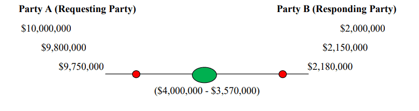Wenn Parteien in einer Sackgasse stecken und sich nicht bewegen wollen oder können, verwende ich eine Technik, die Klammern und einen visuellen Trick kombiniert. Ich teile die Lücke durch die Durchschnittszahlen in Klammern (grün hervorgehoben) in zwei Teile: die linke Seite ist näher an dem, was die antragstellende Partei fordert, und die rechte Seite zeigt, was die antwortende Partei anbietet. Sicher, Sie können eine feste Zahl dazwischen angeben, die hier $3.875.000 beträgt. Aber selbst wenn man Elemente des bewertenden Ansatzes verwendet, ist es meiner Meinung nach wichtig, einen gewissen Spielraum zu lassen und den Parteien die Möglichkeit zu geben, zu entscheiden, welche genaue Zahl für beide akzeptabel ist. Visuell sieht es so aus: